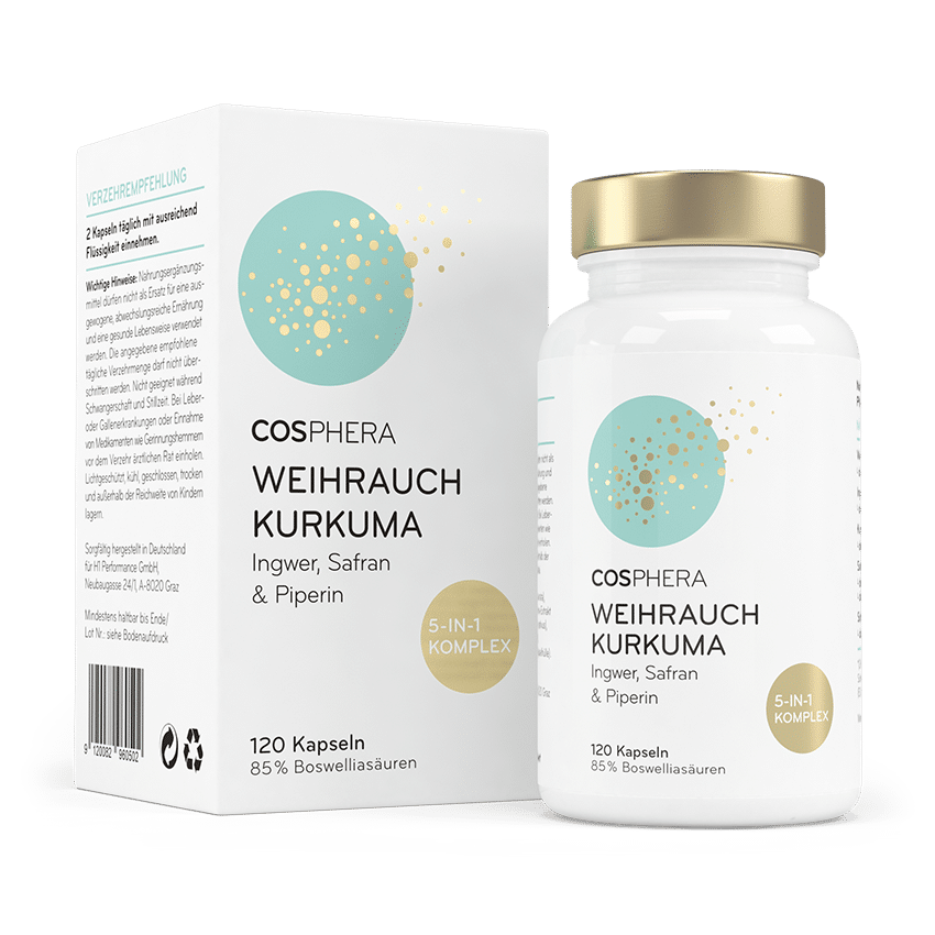 Ergänzt wird der Weihrauch durch ausgewählte Pflanzenextrakte wie Kurkuma, Ingwer, Schwarzer Pfeffer und Safran, die die Vielfalt pflanzlicher Inhaltsstoffe sinnvoll abrunden.